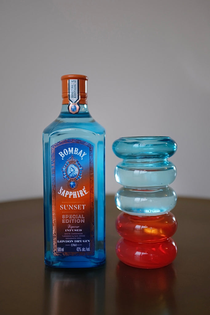 "CHASING SUNSETS" is the new limited edition collection designed by HAND IN HAND founder Cloudy Zakrocki in collaboration with Bombay Sapphire – featuring mouth-blown long drink glasses and recycled coasters made out of eight plastic bottles each.